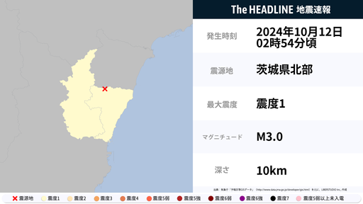 10月12日2時54分頃、茨城県で最大震度1の地震を観測