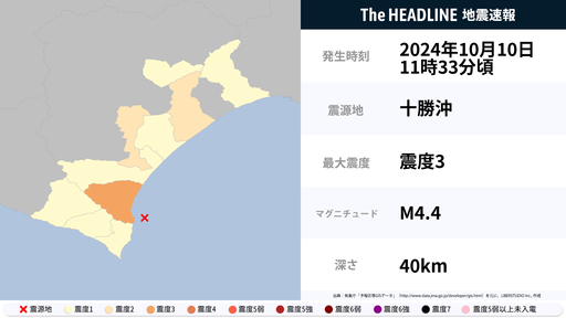 10月10日11時33分頃、北海道で最大震度3の地震を観測