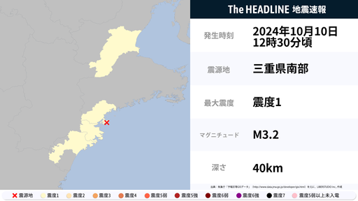 10月10日12時30分頃、三重県で最大震度1の地震を観測