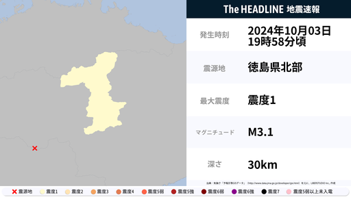 10月3日19時58分頃、徳島県で最大震度1の地震を観測