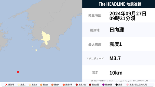 9月27日9時31分頃、高知県で最大震度1の地震を観測