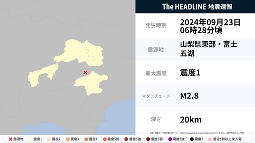 9月23日6時28分頃、神奈川県・山梨県で最大震度1の地震を観測