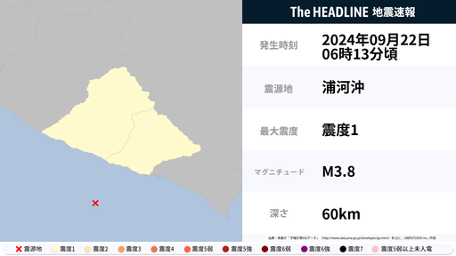 9月22日6時13分頃、北海道で最大震度1の地震を観測