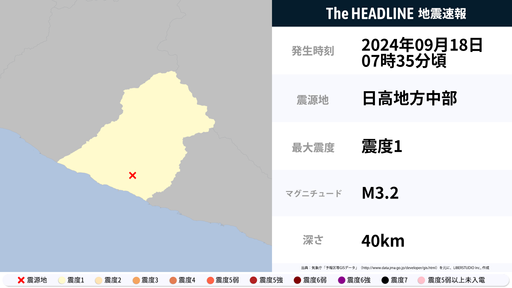 9月18日7時35分頃、北海道で最大震度1の地震を観測