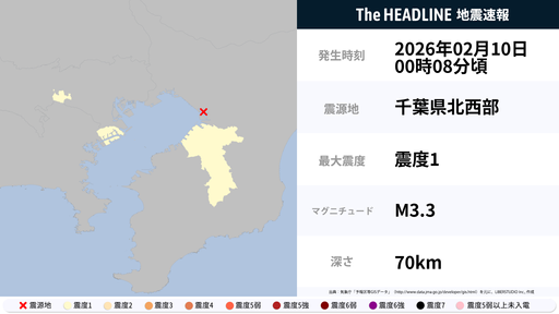 2月10日0時8分頃、千葉県・東京都などで最大震度1の地震を観測