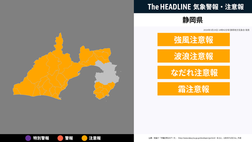 3月19日14時42分頃、静岡県の強風注意報・波浪注意報などが更新