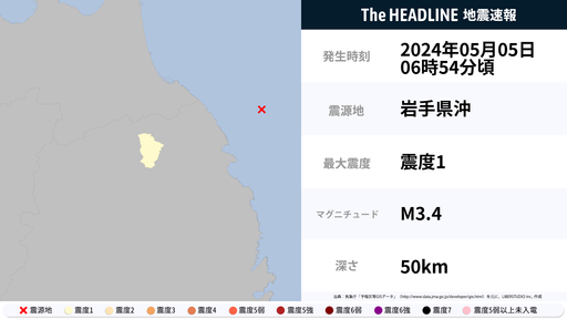 5月5日6時54分頃、岩手県で最大震度1の地震を観測