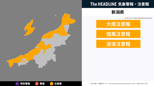 11月11日0時6分頃、新潟県に大雨注意報・強風注意報などが発表