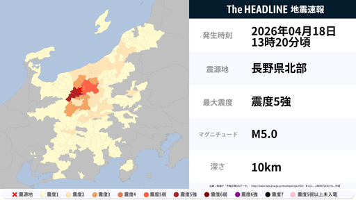 4月18日13時20分頃、長野県で最大震度5強の地震を観測