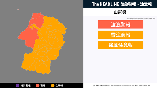 1月10日15時52分頃、山形県に波浪警報・雷注意報などが発表