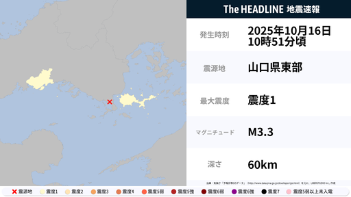10月16日10時51分頃、山口県で最大震度1の地震を観測