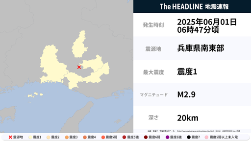 6月1日6時47分頃、兵庫県で最大震度1の地震を観測