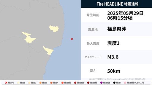 5月29日6時15分頃、福島県・茨城県で最大震度1の地震を観測
