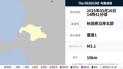 5月26日14時41分頃、秋田県で最大震度1の地震を観測