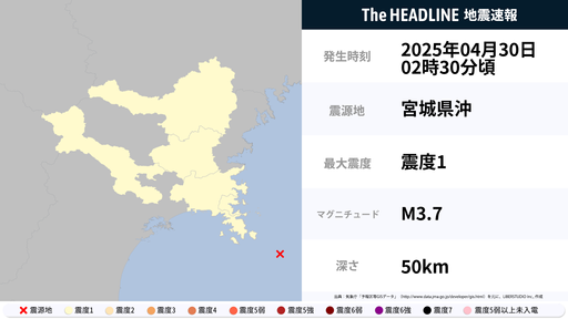 4月30日2時30分頃、岩手県・宮城県で最大震度1の地震を観測