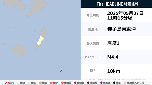 5月7日11時15分頃、鹿児島県で最大震度1の地震を観測