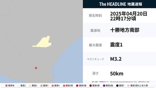 4月20日22時17分頃、北海道で最大震度1の地震を観測