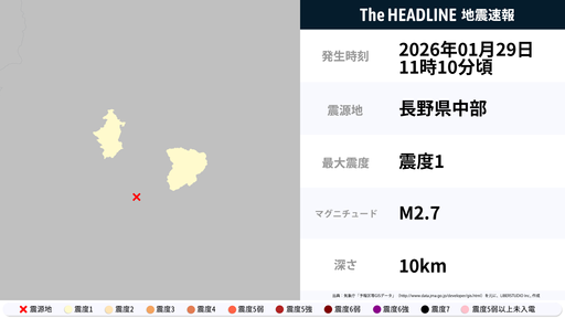 01月29日11時10分頃、長野県中部を震源とするマグニチュード2.7の地震が観測された。最大震度1を観測したのは、長野県。観測が発表されている主な地域は、以下の通り ▽震度1