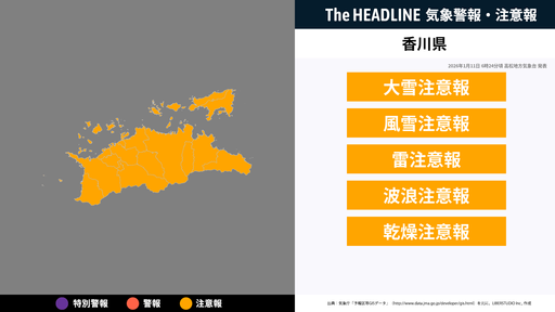 1月11日6時8分、高松地方気象台は、香川県に発表されている警報・注意報の経過、予測、防災上の留意点などを解説するために発表していた気象情報を更新した。高松地方気象台の発表内容香川県では、11日...