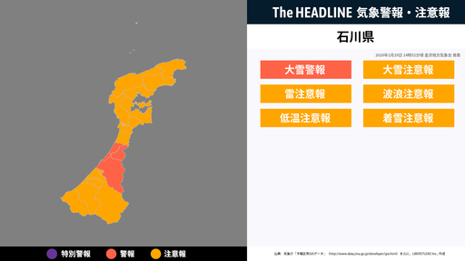 1月29日14時52分頃、石川県の大雪警報・大雪注意報などが更新