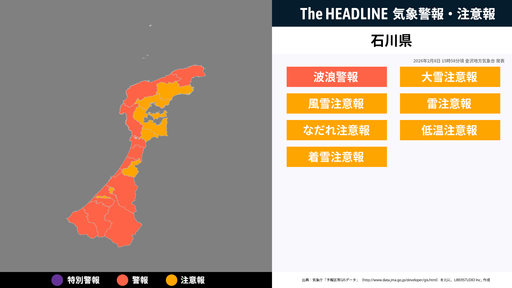 2月8日15時58分頃、石川県の波浪警報・大雪注意報などが更新