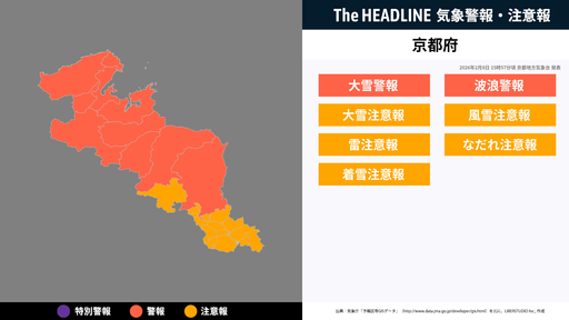 2月8日15時57分、京都地方気象台より京都府に大雪警報・波浪警報などが発表された。対象の市区町村にお住まいの方は、最新の情報を入手しつつ、避難や警戒など適切な行動を取る必要がある。京都府では、...