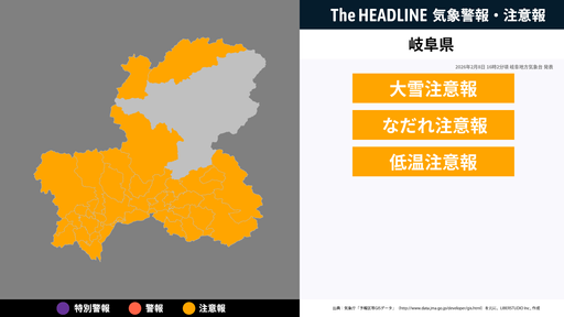 2月8日16時2分頃、岐阜県に大雪注意報・なだれ注意報などが発表