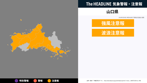 3月4日4時38分頃、山口県の強風注意報・波浪注意報が更新