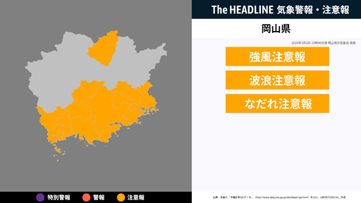3月2日15時40分、岡山地方気象台より岡山県に強風注意報・波浪注意報などが発表された。南部では、2日夜遅くから3日昼前まで強風や高波に注意。北部では、2日までなだれに注意