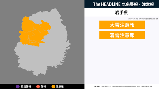 11月18日15時58分頃、岩手県に大雪注意報・着雪注意報が発表