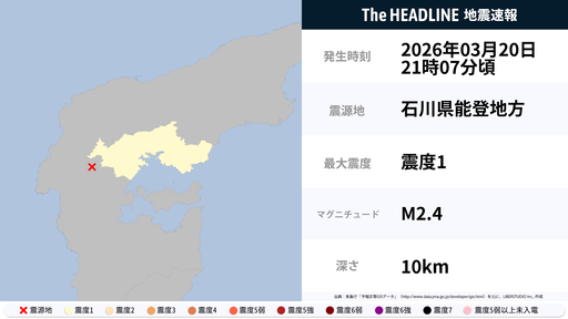 3月20日21時7分頃、石川県能登地方を震源とするマグニチュード2.4の地震が観測された。最大震度1を観測したのは、石川県。観測が発表されている主な地域は、以下の通り ▽震度1石川県能登また、気...