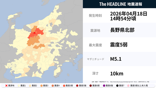 04月18日14時54分頃、長野県北部を震源とするマグニチュード5.1の地震が観測された。最大震度5弱を観測したのは、長野県。観測が発表されている主な地域は、以下の通り ▽震度5弱