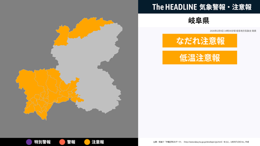 2月9日14時36分、岐阜地方気象台より岐阜県になだれ注意報・低温注意報が発表された。岐阜県では、10日までなだれに注意。美濃地方では、10日まで低温に注意