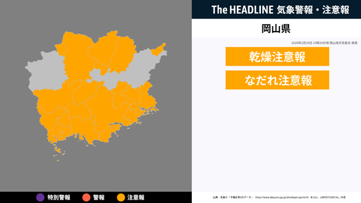 2月20日4時12分頃、岡山県に乾燥注意報・なだれ注意報が発表