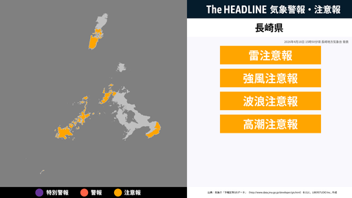 4月18日15時50分頃、長崎県の雷注意報・強風注意報などが更新