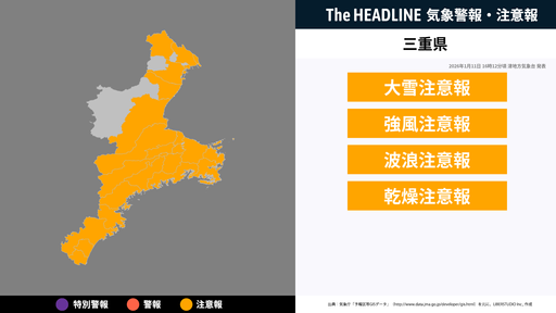 1月11日16時12分、津地方気象台より三重県に大雪注意報・強風注意報などが発表された。三重県では、強風と、空気の乾燥した状態が続くため火の取り扱いに注意。北中部では、大雪に注意。南部では、高波...