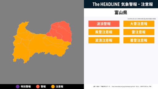 1月11日16時3分頃、富山県に波浪警報・大雪注意報などが発表